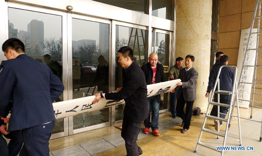 Workers remove the name plaque of the Ministry of Health in Beijing, capital of China, March 17, 2013. The newly-founded National Health and Family Planning Commission hung out its name plaque on Sunday morning, replacing the name plaque of the now-defunct Ministry of Health. (Xinhua/Lv Nuo)