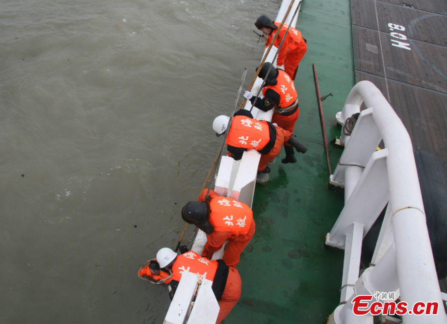 Rescuers search for drowning crew members after a container ship sinks in the Bohai Bay, somewhere 40 nautical miles northeast of Longkou, Shandong Province, March 18, 2013. Rescuers have retrieved 12 bodies. The ship "Guangyangxingang" with 14 aboard was traveling from the northern coastal city of Tianjin to Taizhou in eastern Zhejiang Province, and capsized and sank at around 5:15 p.m. on Monday amid strong winds. The Beihai Rescue Bureau of the Ministry of Transport dispatched two rescue vessels and a helicopter to conduct rescue work. [Photo: CNS/Li Renliang]