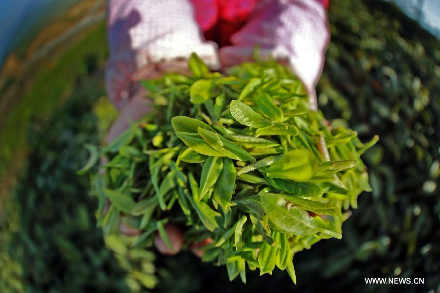 A tea farmer presents a handful of newly-picked tea leaves at the Lushan Yunwu Tea Base in Jiujiang City, east China's Jiangxi Province, March 18, 2013. Tea farmers here are busy with picking tea leaves before the Qingming Festival which falls on April 4 this year, as this kind of tea is regarded to have the best taste among all green teas. (Xinhua/Zhang Haiyan)