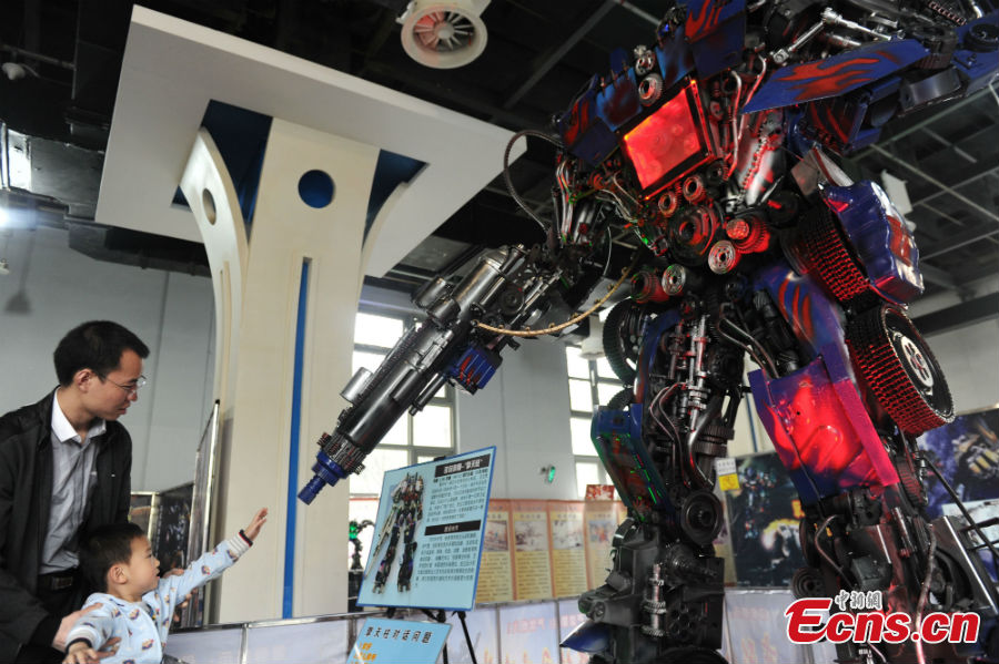 A robot statue is on display at an exhibition featured on characters of the American science fiction action film Transformers in Chengdu, Southwest China's Sichuan Province, March 19, 2013. The statues were made of parts from written-off vehicles. [Photo: CNS/Zhang Lang]