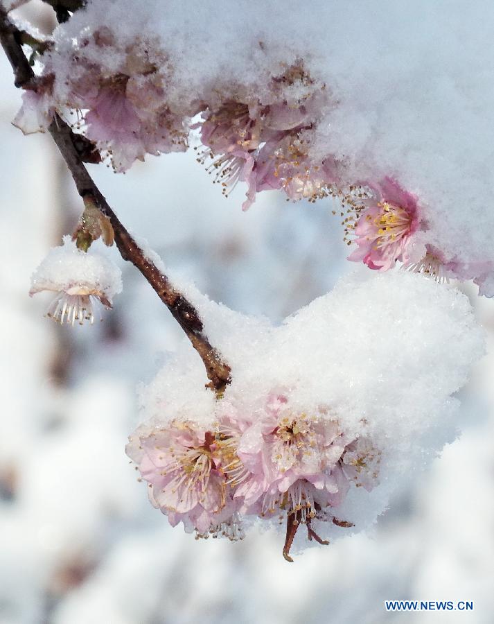 Photo taken on March 20, 2013 shows the snow-covered cherry blossoms at the Yuyuantan Park in Beijing, capital of China. Beijing witnessed a snowfall with a depth reaching 10-17 centimeters overnight. The snowfall happened to hit the city on the Chinese traditional calendar date of Chunfen, which heralds the beginning of the spring season. Chunfen, which literally means Spring Equinox or Vernal Equinox, falls on the day when the sun is exactly at the celestial latitude of zero degrees. (Xinhua/Li Xin)