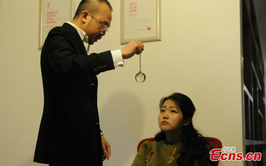 Tang Tang (L), a sound sleep therapist, hypnotizes a woman in a sound sleep center in Changsha, the capital of Hunan Province, March 19, 2013. It is the first time for the government to issue a business license to a sound sleep center in Hunan. The center is focused on improving people's sleep and reducing their psychological pressure. [Photo: CNS/Yang Huafeng]