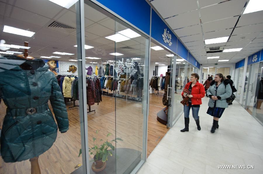 File photo taken on Feb. 28, 2012 shows Russians visiting a shop of a Chinese clothing brand at the Greenwood International Trade Center in Moscow, Russia. The Greenwood International Trade Center, a 350-million-U.S.-dollar program financed by China Chengtong Development Group, started operation in Moscow in Spet. 2011. The Greenwood covers an area of 200,000 square meters, with a total construction area of 132,600 square meters. The trade center, the largest Chinese investment project in the field of commerce in Russia, serves as a platform for Chinese products to enter the Russian market. (Xinhua/Jiang Kehong)