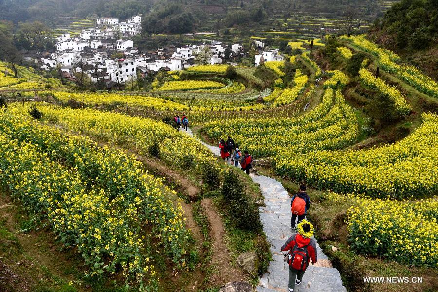 Tourists walk among rape flowers at Jiangling terrace fields in Wuyuan County, east China's Jiangxi Province, March 21, 2013. Rape flowers in Wuyuan entered the best season for viewing. (Xinhua/Song Zhenping)