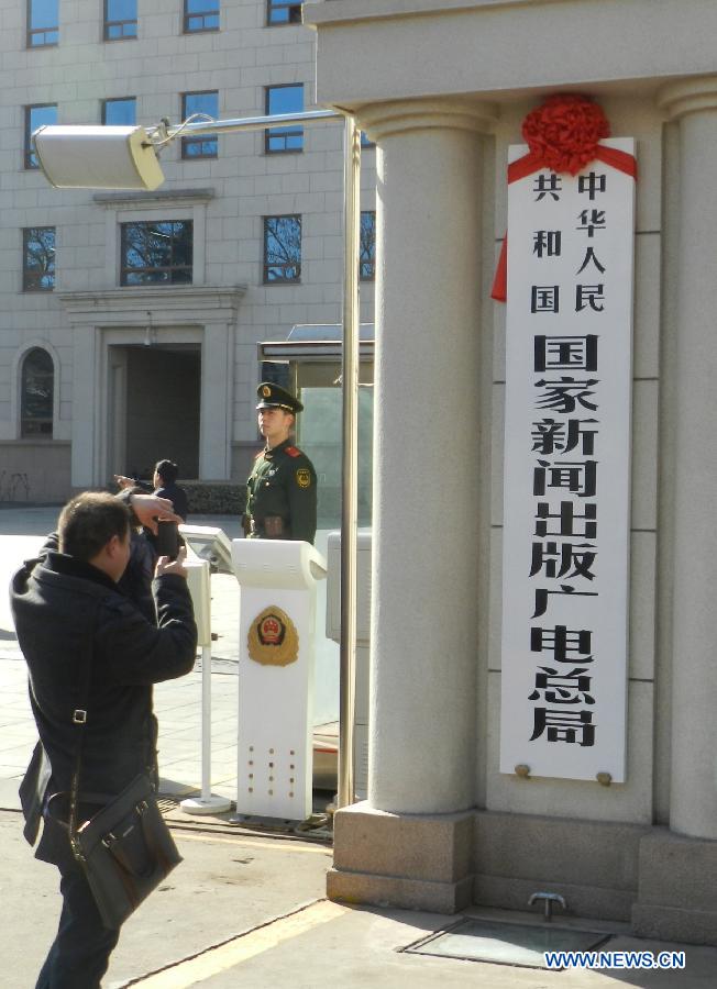 A tourist takes photos of the newly-hung nameplate State General Administration of Press, Publication, Radio, Film and Television in Beijing, capital of China, March 22, 2013. China's National People's Congress, the country's top legislature, has adopted a cabinet reshuffle plan in which two media regulators, the General Administration of Press and Publication and the State Administration of Radio, Film and Television, were merged into a single entity to oversee the country's press, publication, radio, film and television sectors. (Xinhua/Wang Zhen)