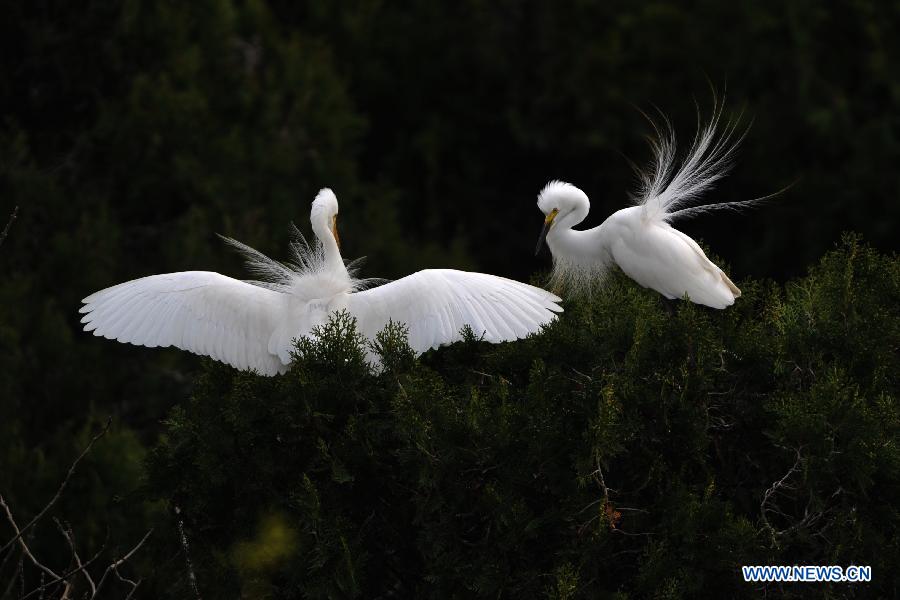 White egrets are seen at the wetland of Hongze Lake in Sihong County, east China's Jiangsu Province, March 24, 2013. (Xinhua/Xu Chenghong)