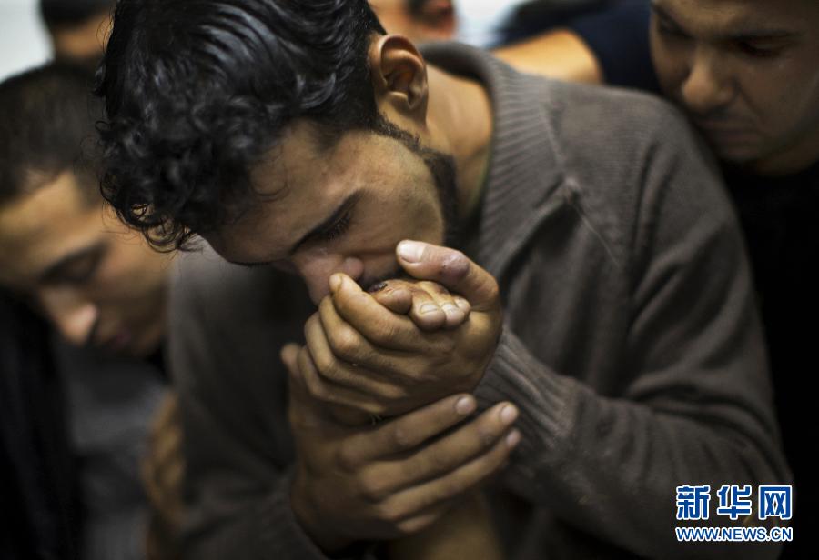 A Palestinian man kisses the hand of a dead relative in the morgue of Shifa Hospital in Gaza City., Nov. 18, 2012.(Bernat Armangue)