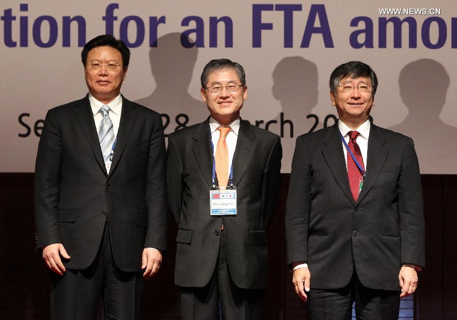 Representative of China Yu Jianhua (L) poses for a photo with his Japanese counterpart Koji Tsuruoka (R) and his South Korean counterpart Choi Kyong-lim before their trilateral talks in Seoul, capital of South Korea, on March 26, 2013. China, Japan and the Republic of Korea (ROK) on Tuesday started the first round of trilateral talks on the free trade agreement (FTA) in the ROK's capital, which will continue until Thursday. (Xinhua/Park jin-hee)