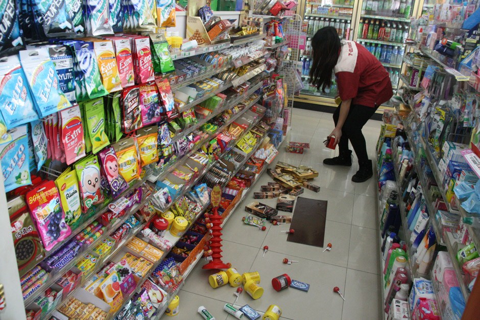 Stuff falls off shelves in a supermarket in Taipei, Taiwan, March 27, 2013. An earthquake measuring 6.0 on the Richter scale jolted Taiwan at 02:03:20 GMT on Wednesday. The epicenter, with a depth of 20.70 km, was initially determined to be at 23.8396 degrees north latitude and 121.1346 degrees east longitude. [Photo: Central News Agency]