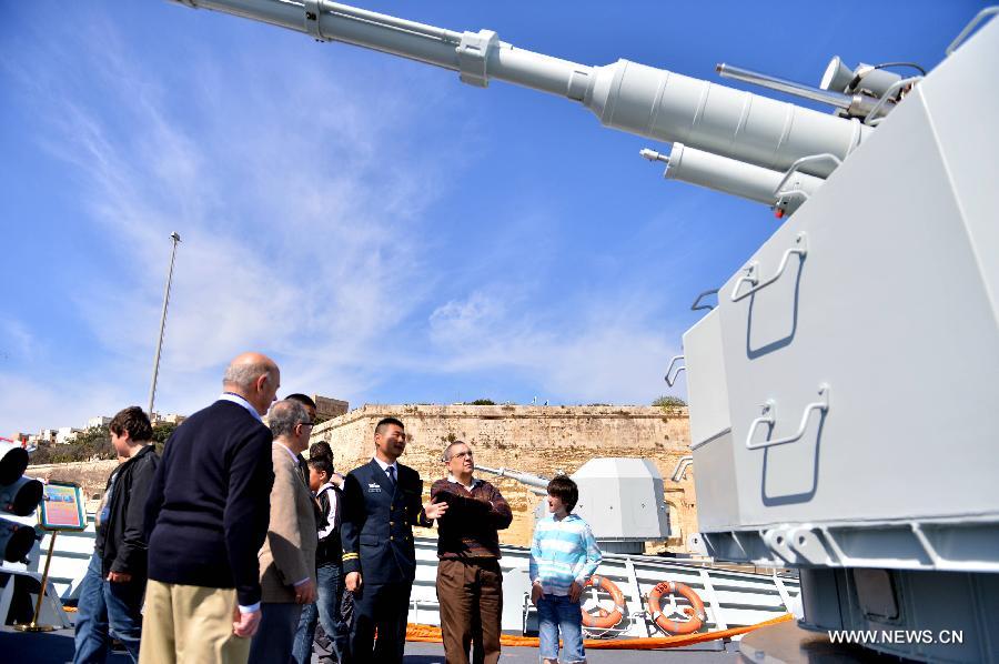 Local Maltese and tourists visit the Chinese frigate "Hengyang" at the grand habour of Valletta, Malta, on March 27, 2013. An Open Day of the "Hengyang" for Maltese was held on Wednesday. The 13th naval escort squad, sent by the Chinese People's Liberation Army (PLA) Navy, arrived at Valletta of Malta on Tuesday for a five-day visit after finishing its escort missions. (xinhua/Xu Nizhi)