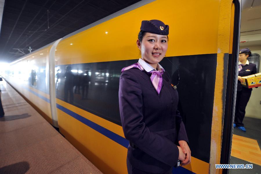 An attendant stands next to a bullet train when a test run of the Nanjing-Hangzhou High-Speed Railway ends at Nanjing South Railway Station in Nanjing, capital of east China's Jiangsu Province, March 28, 2013. The new Nanjing-Hangzhou High-Speed Railway is a supplement to railway travelling within China's Yangtze River Delta. The 249-kilometer rail line will reduce travel time from Nanjing to Hangzhou to about an hour. (Xinhua/Wang Dingchang)