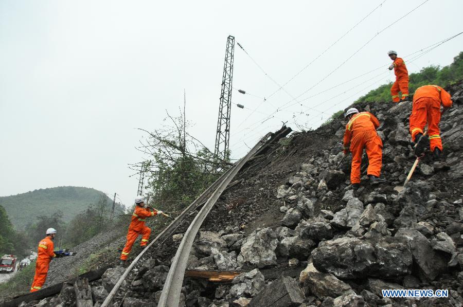 Rescuers work at the site where a landslide hit one section of Chongqing-Guiyang Railway in southwest China's Guizhou Province, March 31, 2013. The landslide caused 2 trains off-the-line and 5 trains rechannel. (Xinhua/Zhou Tao)