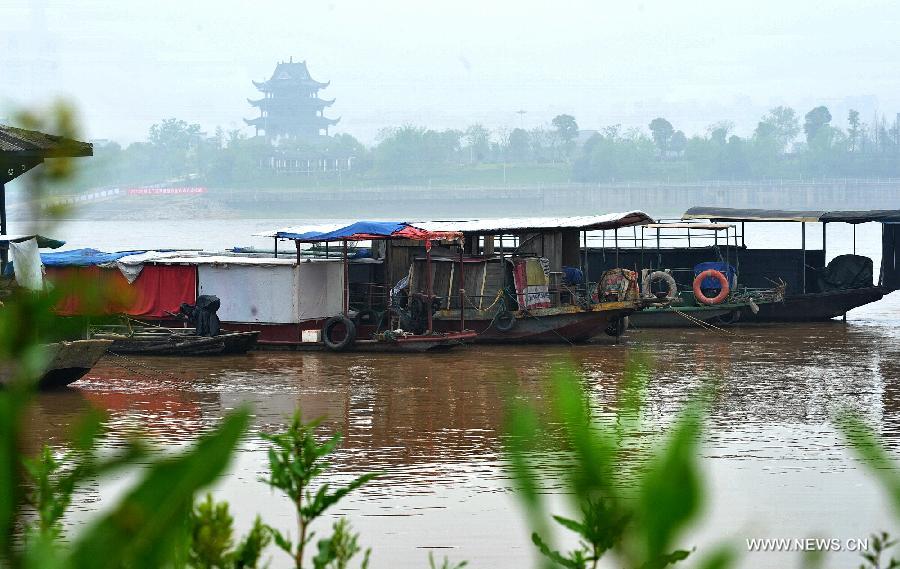 Fishing boats are anchored on the water off the Juzizhou, an islet on the Xiangjiang River, in Changsha, capital of central China's Hunan Province, April 1, 2013. A three-month fishing ban on the main stream of the Xiangjiang River, linking Yongzhou City and Yueyang City of the province, began on the noon of April 1, in order to protect fishery resources and keep the bio-diversity of the river. (Xinhua/Long Hongtao)