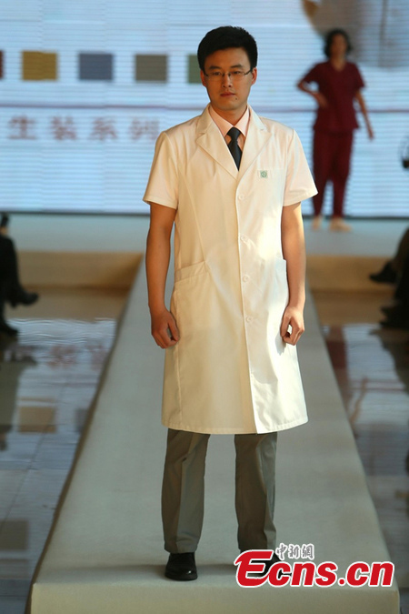 A man displays a uniform for doctor in Beijing, April 1, 2013. Beijing planed to change hospital uniforms for doctors, nurses, logistics workers and patients. (CNS photo)