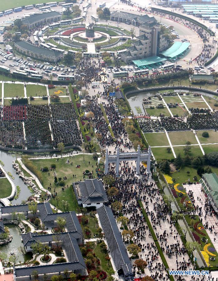 Photo taken on April 4, 2013 from a police helicopter to show a cemetery in Shanghai, east China. The Public Security Bureau of Shanghai dispatched two police helicopters on the tomb-sweeping day to monitor the traffic around the tomb-sweeping areas so as to better guide citizens to avoid traffic peak. (Xinhua/Fan Jun)