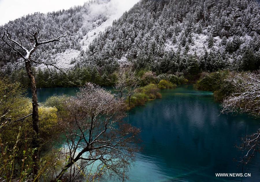 Photo taken on April 5, 2013 shows the scenery of snow covered trees by the Huohua Lake in Jiuzhaigou Valley, southwest China's Sichuan Province. (Xinhua/Sangey)