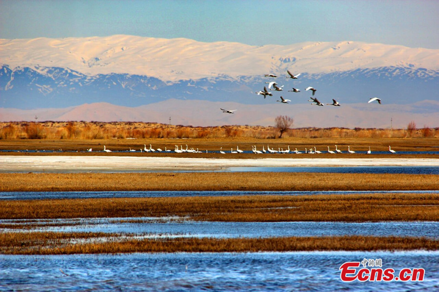 Migratory birds are seen at the Keketuohai Wetland Nature Reserve of Habahe County in Northwest China's Xinjiang Uygur Autonomous Region on April 6, 2013. Thousands of migratory birds, including swans, egrets and ducks, fly back to the reserve as spring approaches. [Photo/Wang Hongshan]
