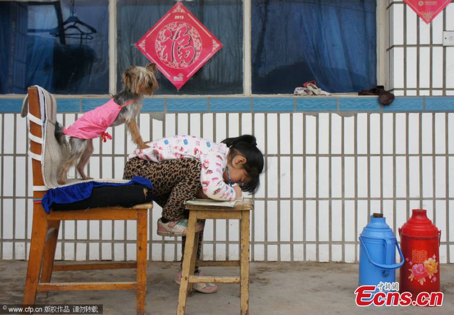 A village girl is doing homework outside in Fangshan District, Beijing, April 5, 2013. "If friends and relatives in Luoyang enquire for my feelings, I would say I am busy doing homework." Recently, the adaption of an ancient Chinese poem spread widely on the country's Internet as it portrayed schoolchildren do homework anywhere anytime.
