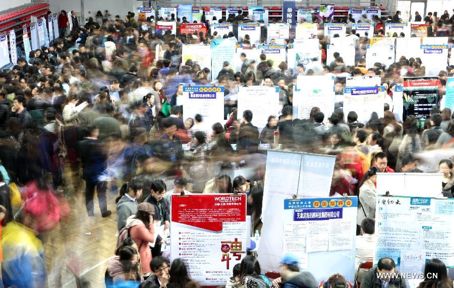 Job hunters take part in a job fair at the Tianjin University of Finance and Economics in Tianjin, north China, April 10, 2013. The job fair attracted 225 enterprises and institutions, providing 4,700 job vacancies for college graduates. (Xinhua/Liu Dongyue)
