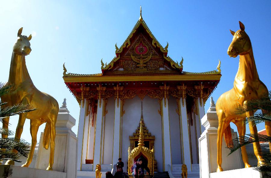 Photo taken on April 10, 2013 shows the Thai-style Buddha hall at the Baima Temple, or the White Horse Temple, in Luoyang City, Central China's Henan Province. Visitors can see Buddha halls with different styles of foreign countries at the Baima Temple, the oldest Buddhist temple in China.(Xinhua/Wang Song)