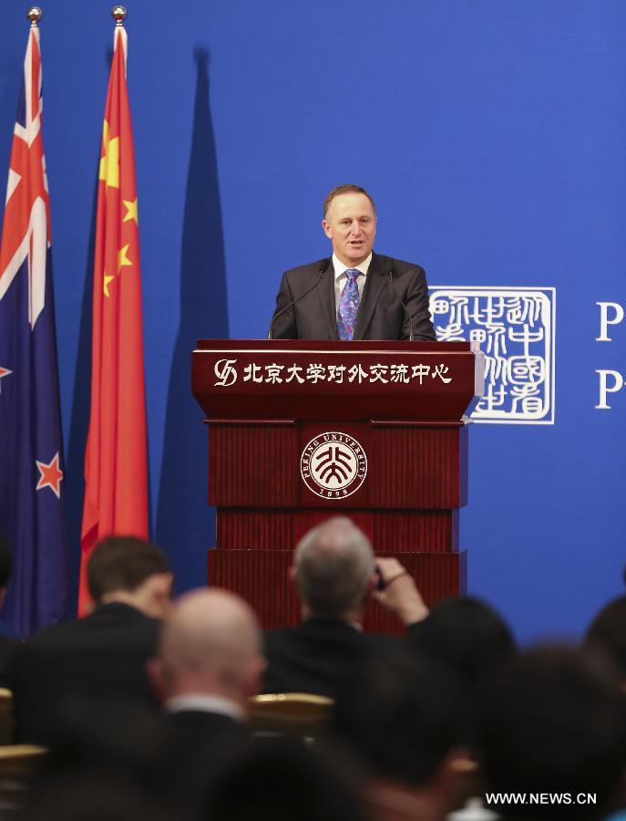 John Key, prime minister of New Zealand, delivers a speech at Peking University in Beijing, capital of China, April 11, 2013. (Xinhua/Ding Lin)