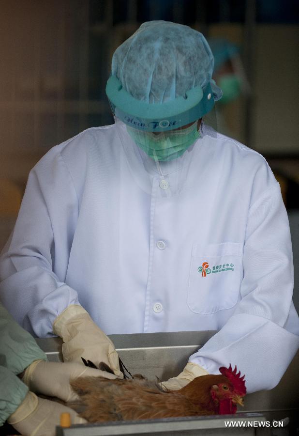 A staff member of the Hong Kong Food and Environmental Hygiene Department makes a flu test on a chosen chicken in Hong Kong, south China, April 11, 2013. The Hong Kong Food and Environmental Hygiene Department are carrying out avian influenza tests on imported chicken to ensure they are virus-free Thursday. (Xinhua/Lui Siu Wai)