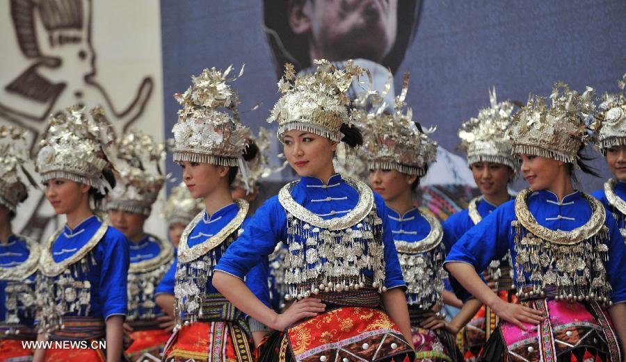 Models present costumes of the Miao ethnic group at the Guangxi Museum of Nationalities in Nanning, capital of south China's Guangxi Zhuang Autonomous Region, April 12, 2013. A total of 210 set of traditional costumes of the Miao ethnic group went on display here on Friday. Costumes of the Miao ethnic group is well known for its fine craftsmanship, brilliant colors, various styles and rich cultural connotations. (Xinhua/Lu Boan)