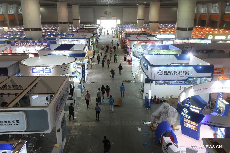 Working staff make preparations for the upcoming 113th China Import and Export Fair at the exhibition hall in Guangzhou, capital of south China's Guangdong Province, April 14, 2013. The fair will kick off on April 15. (Xinhua/Xing Guangli)