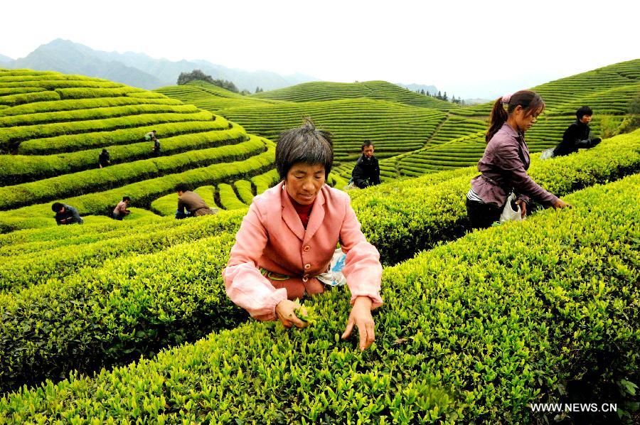 Workers pick tea leaves at a tea garden in Wuyi County, east China's Zhejiang Province, April 14, 2013. (Xinhua/Zhang Jiancheng)