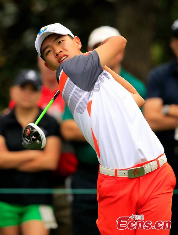 China's Guan Tianlang, the youngest players ever to make the cut at the Maters, hits his tee shot during the final round at the Augusta National Golf Club, Augusta, Ga, April 14, 2013. The 14-year-old completed his first Masters on Sunday with a 3-over par round of 75, to finish 12 over for the tournament and in 58th place. [Osports Photo]