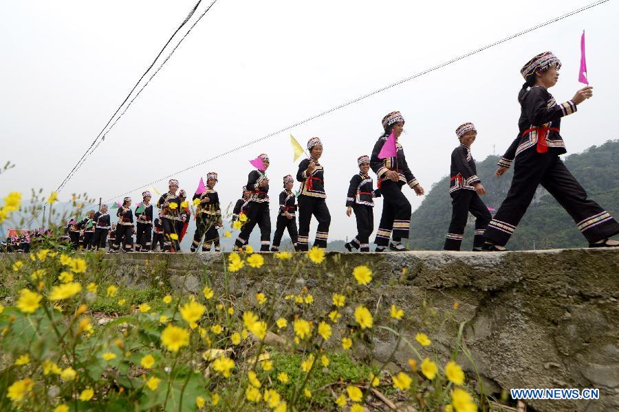 Locals parade for an annual temple fair honoring Cenwang (King Cen), a legendary hero of Zhuang ethnic group, at Daleng Township in Baise City, south China's Guangxi Zhuang Autonomous Region, April 15, 2013. (Xinhua/Wei Wanzhong)