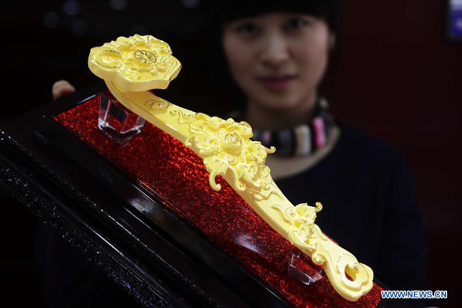 A salesperson shows a gold product in a gold shop in Qingdao, east China's Shandong Province, April 15, 2013. Gold futures on the COMEX division of the New York Mercantile Exchange suffered their biggest one-day decline since the 1980s on April 15, with the most active gold contract for June delivery tumbling 140.3 dollars, or 9.27 percent, to settle at 1,361.1 dollars per ounce. (Xinhua/Yu Fangping)