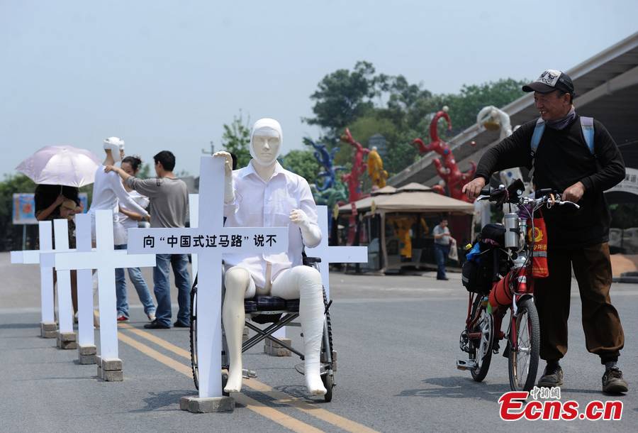 Crosses with words "say no to Chinese-style street crossing" are erected around two mannequins bound by bandage in street of downtown Chongqing, April 16, 2013. The installation warned people to obey traffic regulations. [CNS Photo/Chen Chao]
