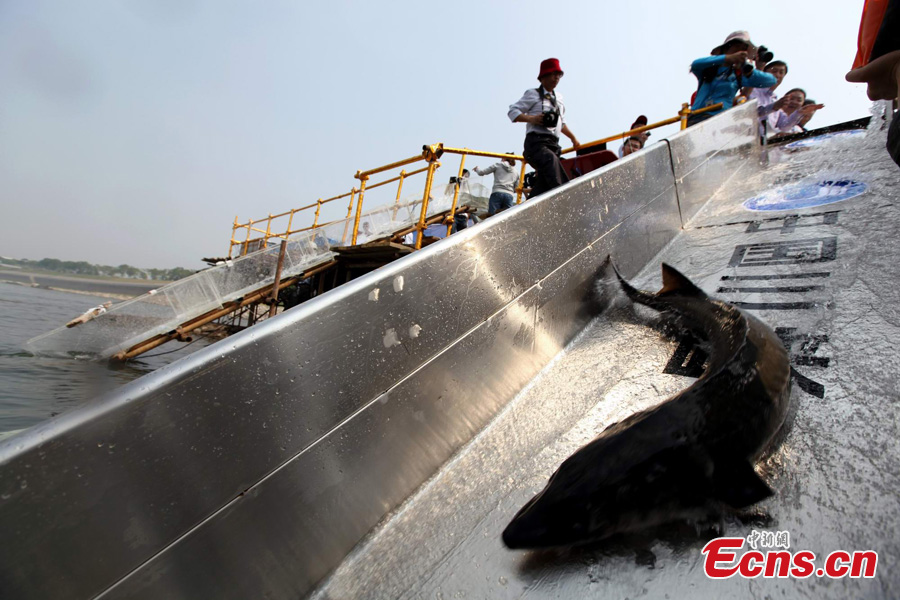 A Chinese sturgeon is released into the Yangtze River in Yichang, Central China's Hubei Province, April 17, 2013. Chinese sturgeon is a protected fish species that dates back 140 million years. They are known as "living fossils of fish," because they are the world's oldest vertebrates. [Photo: CNS/Liu Liangwei]