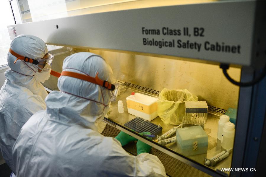 Researchers in protective suits test samples of a suspected case of the H7N9 avian influenza virus at the provincial center for disease control and prevention in Hangzhou, capital of east China's Zhejiang Province, April 17, 2013. An emergent testing team on 24-hour stand-by was set up in the center after the recent spread of the H7N9 virus. Infections within the province will be officially confirmed by the center. (Xinhua/Xu Yu)