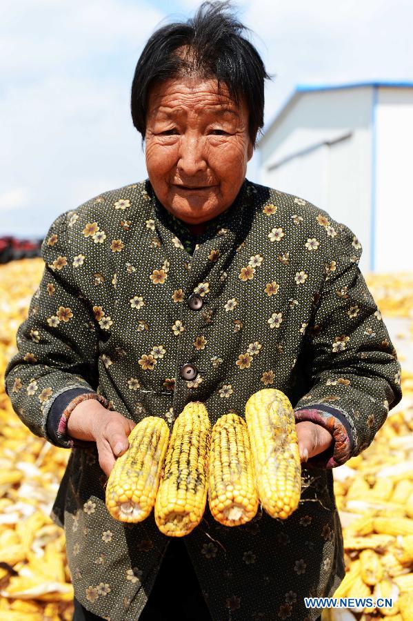 A farmer shows mouldy corns in the field which suffers from serious spring waterlogging in Luobei County, northeast China's Heilongjiang Province, April 17, 2013. Frequent snowfall last winter brought waterlogging to croplands in 63 counties, making 79.36 million mu (about 5.3 million hectares) of arable land contain too much water. Also, earlier and more frequent snowfall last winter prevented local farmers from harvesting ripe corns in time and most corns collected this spring were mouldy. Heilongjiang Province is China's largest producer of commerical grains. (Xinhua/Wang Kai)