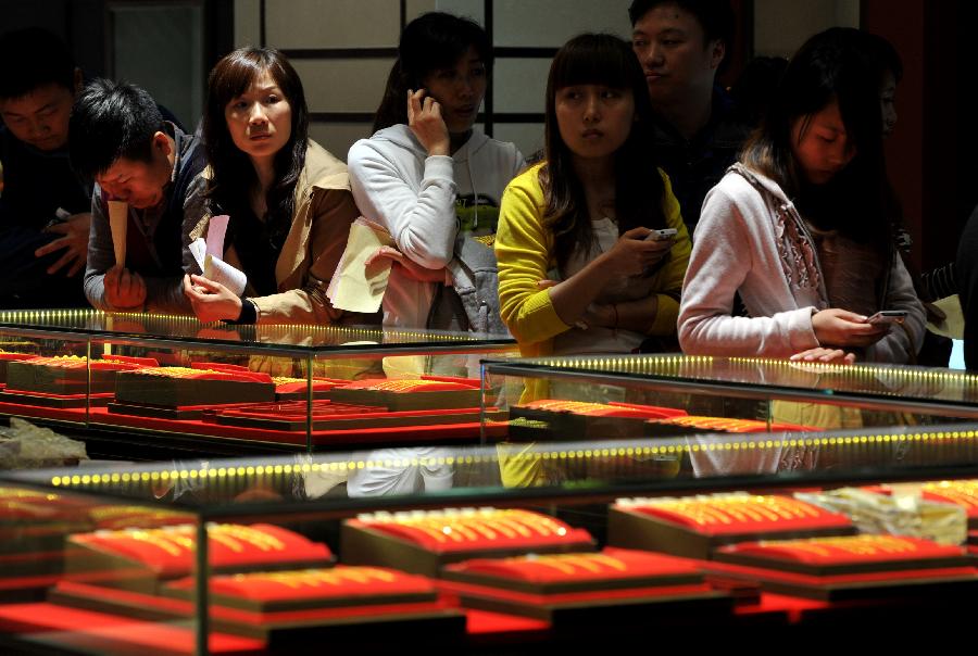 Consumers wait in a line to check out at a gold jewellery shop in Nanjing, capital of east China's Jiangsu Province, April 18, 2013. Gold jewellery shops through China have lowered price of gold jewellery due to the consecutive decline of gold price global markets recently, which boost sales in these shops. (Xinhua)