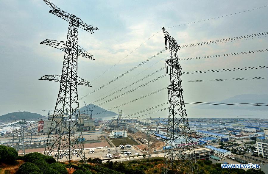 Electricity transmission towers are pictured near the Ningde Nuclear Power Plant in Ningde, southeast China's Fujian Province, April 18, 2013. The nuclear power plant made its generator No. 1 begin operating on Thursday, making it the first of its kind in the province. Ningde nuclear power plant, with four generators in the first phase of construction, is co-funded and jointly run by Guangdong Nuclear Power Group, Datang International Power Generation Co. Ltd., and Fujian Energy Group Co. Ltd. (Xinhua/Zhang Guojun)