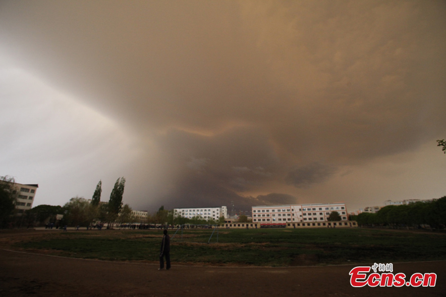 Dark cloud is seen over Bohu County in Northwest China's Xinjiang Uyghur Autonomous Region, April 18, 2013. A brief sandstorm and thunderstorm hit the county at the same time on Thursday, brining low visibility. [Photo: CNS/Ma Weiping]