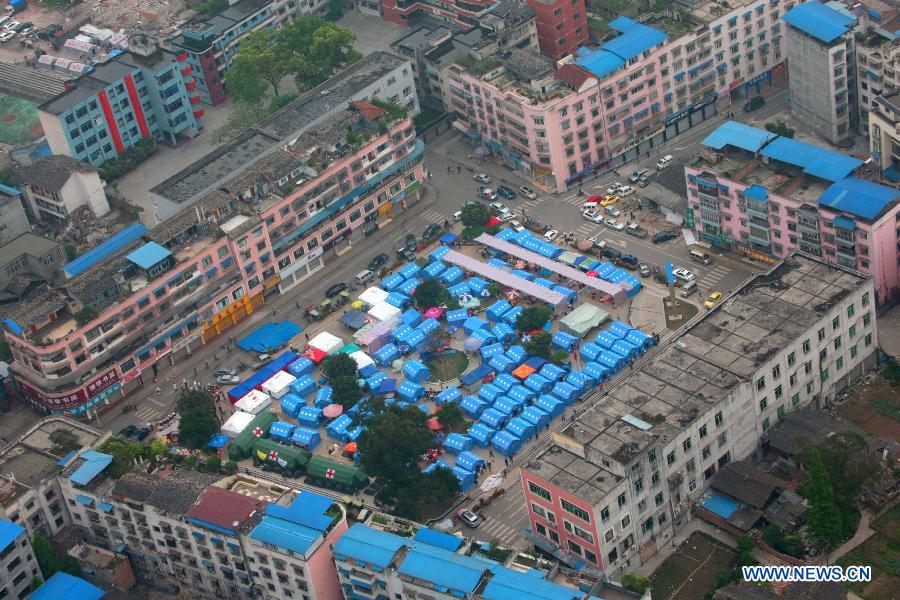 Aerial photo taken on April 21, 2013 shows an evacuation site in a quake-hit area of Ya'an City, in southwest China's Sichuan Province. (Xinhua/Li Gang)