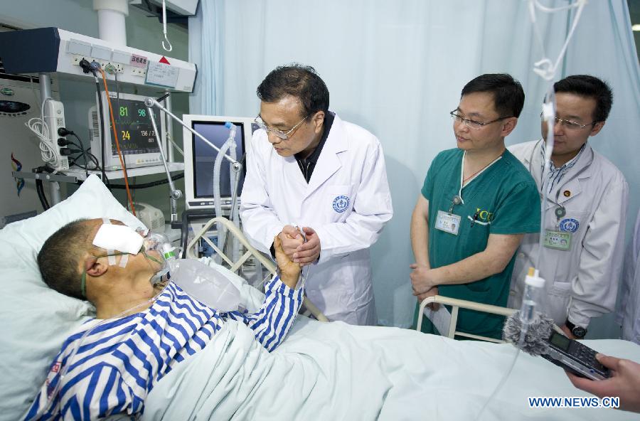 Chinese Premier Li Keqiang (2nd L) visits a patient seriously injured in an earthquake, at Huaxi Hospital in Chengdu, capital of southwest China's Sichuan Province, April 21, 2013. A 7.0-magnitude earthquake jolted Lushan County of Sichuan Province on April 20 morning. (Xinhua/Huang Jingwen)