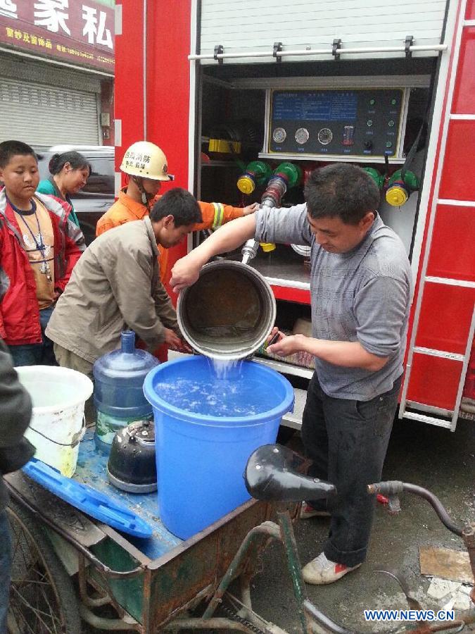 People fetch water for daily needs from a fire engine in quake-hit Lushan County of Ya'an City, southwest China's Sichuan Province, April 21, 2013. A 7.0-magnitude quake jolted Lushan County of Ya'an on Saturday morning. (Xinhua)