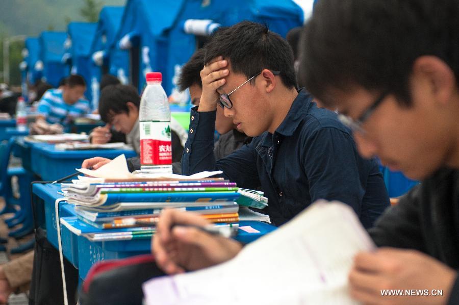 High school students study to prepare the college entrance exam this summer outside tents at a temporary settlement at the Tianquan Middle School in quake-hit Tianquan County, Ya'an City, southwest China's Sichuan Province, April 22, 2013. A 7.0-magnitude earthquake jolted Lushan County of Ya'an City in the morning on April 20. (Xinhua/Liu Jinhai)