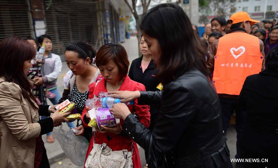 Earthquake victims receive relief materials in Lushan County, Sichuan (1/4)