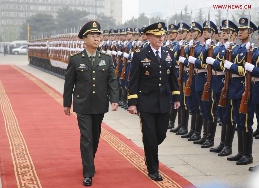 Fang Fenghui (L), chief of the general staff of the Chinese People's Liberation Army, holds a welcoming ceremony for Martin Dempsey, chairman of the U.S. Joint Chiefs of Staff, prior to their talks in Beijing, capital of China, April 22, 2013. (Xinhua/Xie Huanchi)