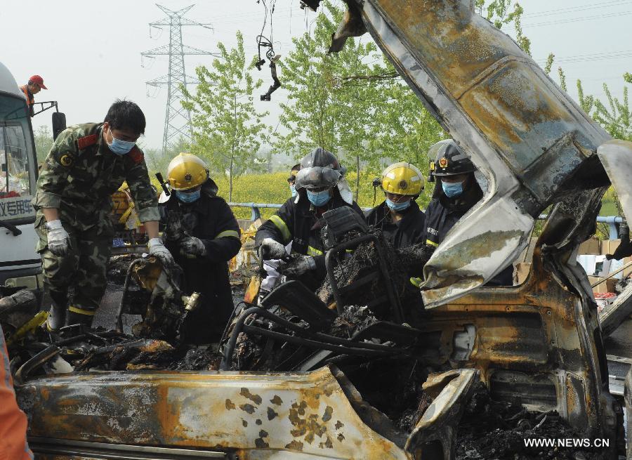 Rescuers work at the accident site after a passenger vehicle rear-ended a truck at an expressway in Yancheng City, east China's Jiangsu Province, April 24, 2013. A fire broke out after the rear-end collision occurred, killing all the 8 people in the passenger vehicle.(Xinhua/Zhou Chenyang)