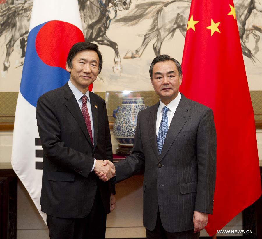 Chinese Foreign Minister Wang Yi (R) shakes hands with Yun Byung-se, foreign minister of the Republic of Korea (ROK), in Beijing, capital of China, April 24, 2013. (Xinhua/Huang Jingwen)