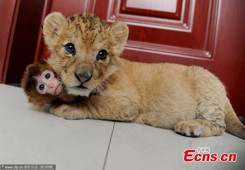 A 14-day-old macaque plays with a 44-day-old lion cub in a zoo in Shenyang, Northeast China's Liaoning Province, April 23, 2013. After being abandoned by his mother, the macaque finally developed a friendship with a lion. [Photo: CFP]
