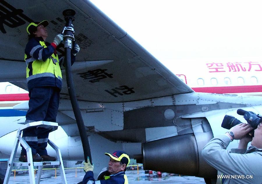 An airplane is injected aviation biofuel at the Shanghai Hongqiao International Airport in Shanghai, east China, April 24, 2013. Sinopec, China's top oil refiner, announced the success of the first test flight powered by the company's newly developed aviation biofuel product on Wednesday. An Airbus A320 owned by China Eastern Airlines landed at Shanghai Hongqiao International Airport on Wednesday morning after completing an 85-minute journey using Sinopec's aviation biofuel, the company said. The biofuel made of palm oil and recycled cooking oil was produced by Sinopec Zhenhai Refining and Chemical Company. (Xinhua/Chen Fei)