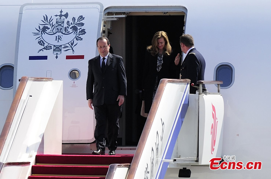 French President Francois Hollande arrives in Beijing, capital of China, April 25, 2013. At the invitation of Chinese President Xi Jinping, Hollande started a state visit to China on Thursday. During the visit, Xi will hold talks with Hollande, and Premier Li Keqiang and Zhang Dejiang, chairman of the Standing Committee of the National People's Congress, will also meet with him. [Photo: CNS/Cui Nan]